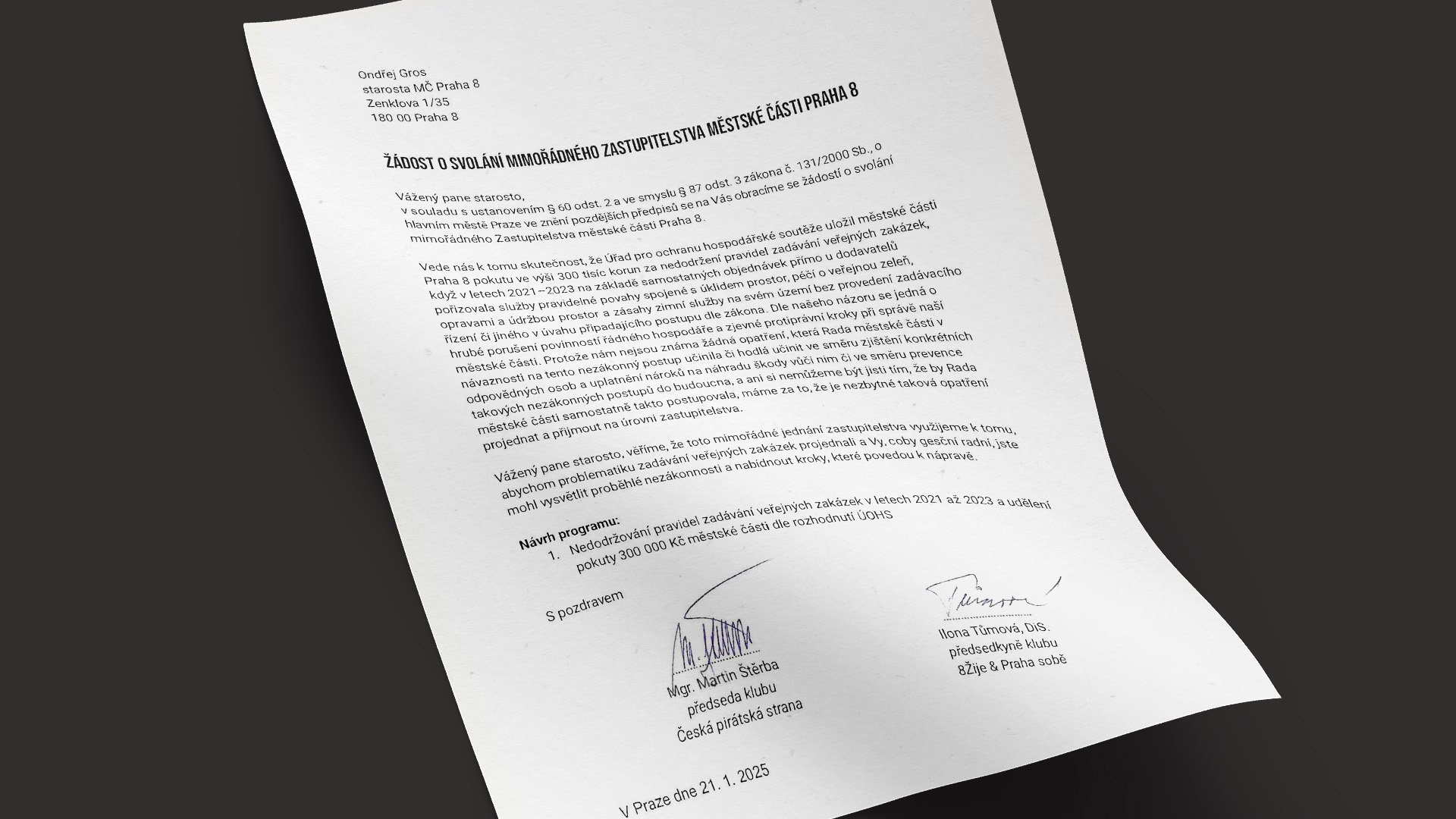 Starosta Prahy 8 Gros je povinen mimořádné zastupitelstvo svolat do 21 dnů od podání žádosti.